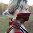 Secure the Noble Gorget by sliding it over the head and sitting it comfortably over the shoulders. Made of thick, hardened top-grain leather, this armour piece is built to withstand the abuse of a LARP or reenactment with regular leather care.