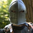 Epic Armoury’s Visored Barbuta is a gracefully curved full-helmet with a distinctive visor. The visor is movable and can be flipped up over the helmet. Whether up or down, the visor can be locked in place with a pin-and-chain. The visor has two rectangular eye-slits, flat nose and a large Maltese-Cross breathing-hole. Wrought to follow the shape of the head and reinforced with a low crest from forehead to neck, the helmet is elegant while still being comfortable to wear.