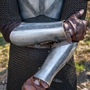 To the untrained eye, these polyurea armours are difficult to distinguish from their metallic counterparts.They are, however, more comfortable to wear and can be worn for long periods of time without discomfort. Indeed, the flexible nature of this armour means that it can bend to the contours of your body in a way that rigid steel will not. Each part is a quarter of the weight of their steel equivalent, allowing for faster movement with less fatigue. Each piece is hand painted with a durable acrylic finish and is detailed to look as realistic as possible. The maintenance free finish will not rust like steel, and can be worn in all kinds of weather. Adjustable leather straps and the flexible nature of the armour allows it to be comfortably worn. These Nordic Light Kit Bracers are inspired by Viking armour and features a beautiful Celtic-inspired ornamenting.